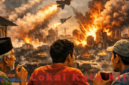 Rampung sholat Tarweh, Budi ndelok video ing YouTube karo getem-getem, amarga isine nuduhake Amerika lan Israel nyerang Iran nganggo rudhal, nganti kahanane Iran korat-karit.